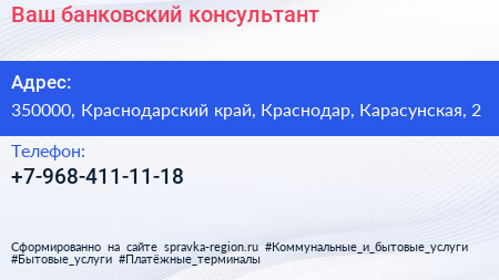 Ваш банковский консультант по адресу 350000, Краснодарский край, Краснодар, Карасунская, 2 в дальнейшем Организация, размещена в следующих категориях: