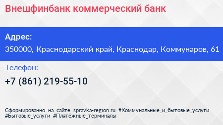 Внешфинбанк, коммерческий банк по адресу 350000, Краснодарский край, Краснодар, Коммунаров, 61 в дальнейшем Организация, размещена в следующих категориях: