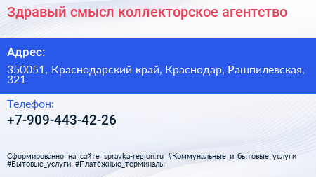 Здравый смысл, коллекторское агентство по адресу 350051, Краснодарский край, Краснодар, Рашпилевская, 321 в дальнейшем Организация, размещена в следующих категориях: