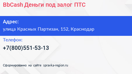 BbCash-Деньги под залог ПТС по адресу улица Красных Партизан, 152, Краснодар в дальнейшем Организация, размещена в следующих категориях: