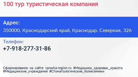100-тур, туристическая компания по адресу 350000, Краснодарский край, Краснодар, Северная, 326 в дальнейшем Организация, размещена в следующих категориях: