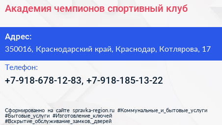 Академия чемпионов, спортивный клуб по адресу 350016, Краснодарский край, Краснодар, Котлярова, 17 в дальнейшем Организация, размещена в следующих категориях:
