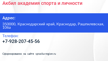 Акбил, академия спорта и личности по адресу 350000, Краснодарский край, Краснодар, Рашпилевская, 106а в дальнейшем Организация, размещена в следующих категориях: