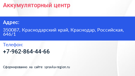 Аккумуляторный центр по адресу 350087, Краснодарский край, Краснодар, Российская, 646/1 в дальнейшем Организация, размещена в следующих категориях: