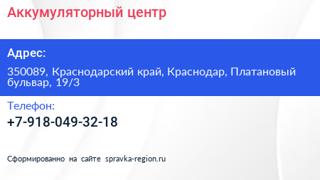 Аккумуляторный центр по адресу 350089, Краснодарский край, Краснодар, Платановый бульвар, 19/3 в дальнейшем Организация, размещена в следующих категориях: