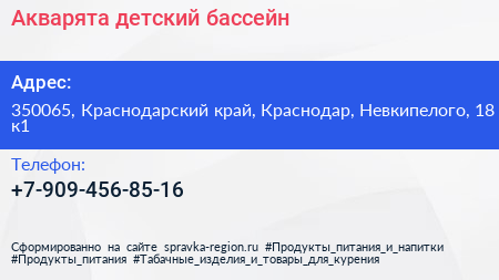 Акварята, детский бассейн по адресу 350065, Краснодарский край, Краснодар, Невкипелого, 18 к1 в дальнейшем Организация, размещена в следующих категориях: