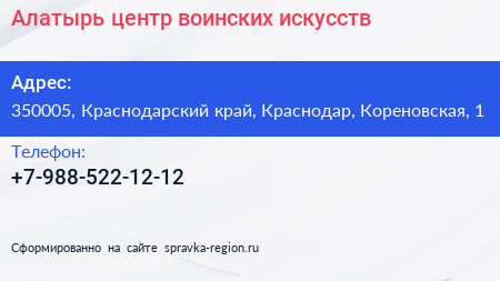 Алатырь, центр воинских искусств по адресу 350005, Краснодарский край, Краснодар, Кореновская, 1 в дальнейшем Организация, размещена в следующих категориях:
