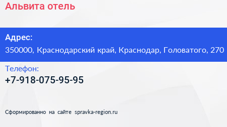 Альвита, отель по адресу 350000, Краснодарский край, Краснодар, Головатого, 270 в дальнейшем Организация, размещена в следующих категориях:
