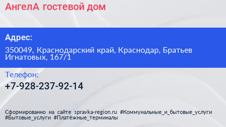 АнгелА, гостевой дом по адресу 350049, Краснодарский край, Краснодар, Братьев Игнатовых, 167/1 в дальнейшем Организация, размещена в следующих категориях: