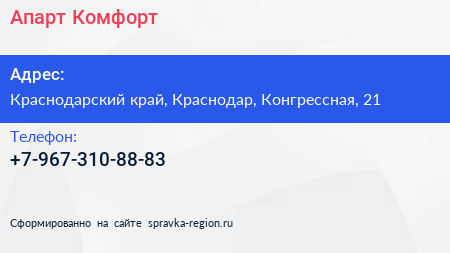 Апарт Комфорт по адресу Краснодарский край, Краснодар, Конгрессная, 21 в дальнейшем Организация, размещена в следующих категориях: