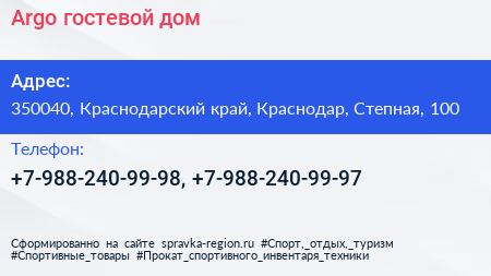 Argo, гостевой дом по адресу 350040, Краснодарский край, Краснодар, Степная, 100 в дальнейшем Организация, размещена в следующих категориях: