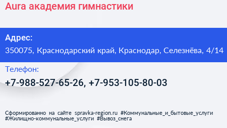 Aura, академия гимнастики по адресу 350075, Краснодарский край, Краснодар, Селезнёва, 4/14 в дальнейшем Организация, размещена в следующих категориях: