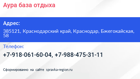 Аура, база отдыха по адресу 385121, Краснодарский край, Краснодар, Бжегокайская, 58 в дальнейшем Организация, размещена в следующих категориях: