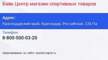 Байк Центр, магазин спортивных товаров по адресу Краснодарский край, Краснодар, Российская, 131/5а в дальнейшем Организация, размещена в следующих категориях: