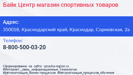 Байк Центр, магазин спортивных товаров по адресу 350018, Краснодарский край, Краснодар, Сормовская, 2а в дальнейшем Организация, размещена в следующих категориях: