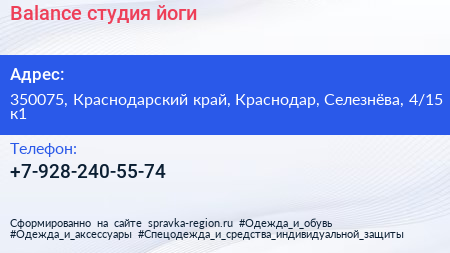 Balance, студия йоги по адресу 350075, Краснодарский край, Краснодар, Селезнёва, 4/15 к1 в дальнейшем Организация, размещена в следующих категориях: