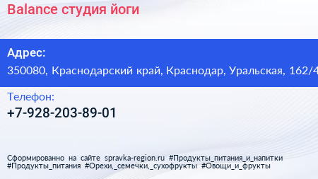 Balance, студия йоги по адресу 350080, Краснодарский край, Краснодар, Уральская, 162/4 в дальнейшем Организация, размещена в следующих категориях: