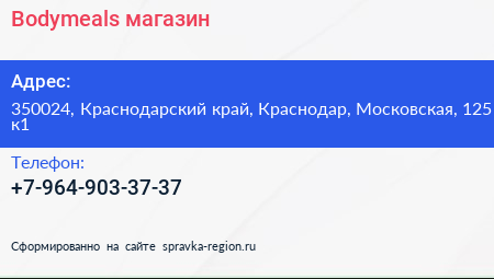 Bodymeals, магазин по адресу 350024, Краснодарский край, Краснодар, Московская, 125 к1 в дальнейшем Организация, размещена в следующих категориях: