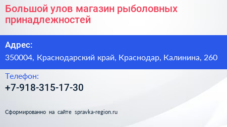Большой улов, магазин рыболовных принадлежностей по адресу 350004, Краснодарский край, Краснодар, Калинина, 260 в дальнейшем Организация, размещена в следующих категориях:
