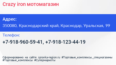 Crazy iron, мотомагазин по адресу 350080, Краснодарский край, Краснодар, Уральская, 99 в дальнейшем Организация, размещена в следующих категориях: