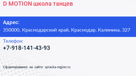 D-MOTION, школа танцев по адресу 350000, Краснодарский край, Краснодар, Калинина, 327 в дальнейшем Организация, размещена в следующих категориях: