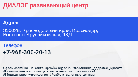 ДИАЛОГ, развивающий центр по адресу 350028, Краснодарский край, Краснодар, Восточно-Кругликовская, 48/1 в дальнейшем Организация, размещена в следующих категориях: