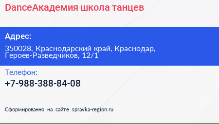 DanceАкадемия, школа танцев по адресу 350028, Краснодарский край, Краснодар, Героев-Разведчиков, 12/1 в дальнейшем Организация, размещена в следующих категориях: