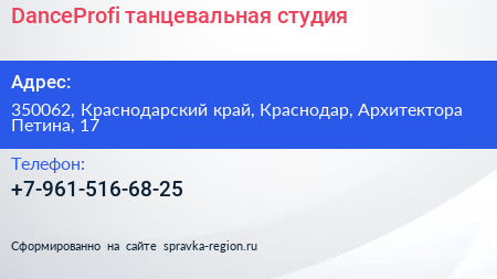 DanceProfi, танцевальная студия по адресу 350062, Краснодарский край, Краснодар, Архитектора Петина, 17 в дальнейшем Организация, размещена в следующих категориях: