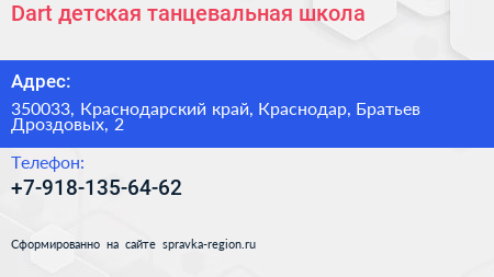 Dart, детская танцевальная школа по адресу 350033, Краснодарский край, Краснодар, Братьев Дроздовых, 2 в дальнейшем Организация, размещена в следующих категориях: