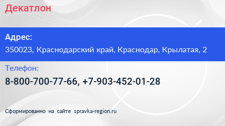 Декатлон по адресу 350023, Краснодарский край, Краснодар, Крылатая, 2 в дальнейшем Организация, размещена в следующих категориях: