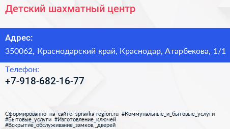 Детский шахматный центр по адресу 350062, Краснодарский край, Краснодар, Атарбекова, 1/1 в дальнейшем Организация, размещена в следующих категориях: