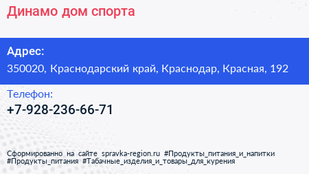 Динамо, дом спорта по адресу 350020, Краснодарский край, Краснодар, Красная, 192 в дальнейшем Организация, размещена в следующих категориях: