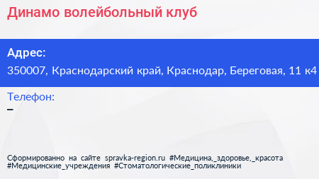 Динамо, волейбольный клуб по адресу 350007, Краснодарский край, Краснодар, Береговая, 11 к4 в дальнейшем Организация, размещена в следующих категориях: