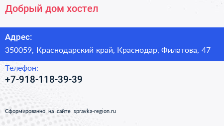 Добрый дом, хостел по адресу 350059, Краснодарский край, Краснодар, Филатова, 47 в дальнейшем Организация, размещена в следующих категориях: