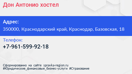 Дон Антонио, хостел по адресу 350000, Краснодарский край, Краснодар, Базовская, 18 в дальнейшем Организация, размещена в следующих категориях: