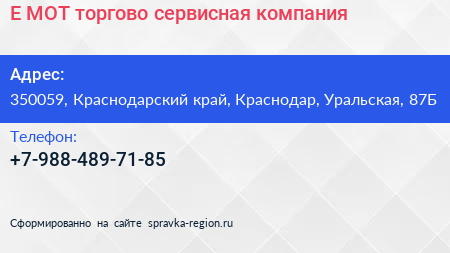 E-MOT, торгово-сервисная компания по адресу 350059, Краснодарский край, Краснодар, Уральская, 87Б в дальнейшем Организация, размещена в следующих категориях: