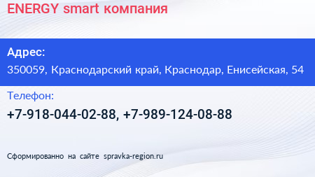 ENERGY smart, компания по адресу 350059, Краснодарский край, Краснодар, Енисейская, 54 в дальнейшем Организация, размещена в следующих категориях: