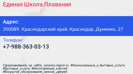 Единая Школа Плавания по адресу 350089, Краснодарский край, Краснодар, Думенко, 27 в дальнейшем Организация, размещена в следующих категориях: