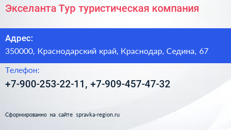 Экселанта-Тур, туристическая компания по адресу 350000, Краснодарский край, Краснодар, Седина, 67 в дальнейшем Организация, размещена в следующих категориях: