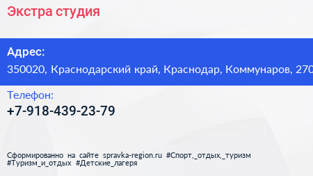 Экстра, студия по адресу 350020, Краснодарский край, Краснодар, Коммунаров, 270 в дальнейшем Организация, размещена в следующих категориях:
