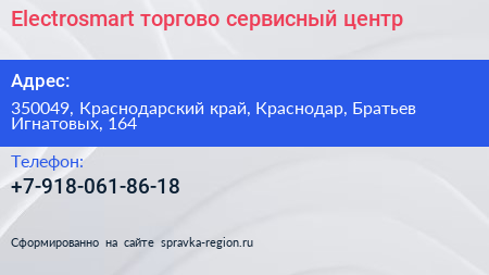 Electrosmart, торгово-сервисный центр по адресу 350049, Краснодарский край, Краснодар, Братьев Игнатовых, 164 в дальнейшем Организация, размещена в следующих категориях: