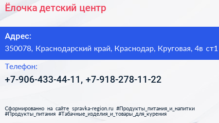 Ёлочка, детский центр по адресу 350078, Краснодарский край, Краснодар, Круговая, 4в ст1 в дальнейшем Организация, размещена в следующих категориях: