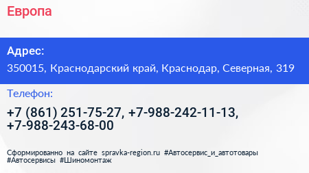 Европа по адресу 350015, Краснодарский край, Краснодар, Северная, 319 в дальнейшем Организация, размещена в следующих категориях: