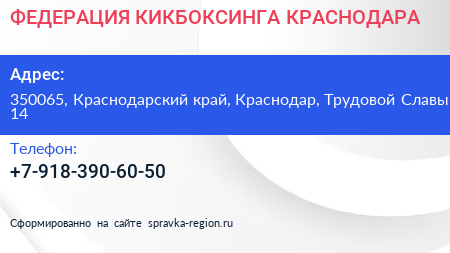 ФЕДЕРАЦИЯ КИКБОКСИНГА КРАСНОДАРА по адресу 350065, Краснодарский край, Краснодар, Трудовой Славы, 14 в дальнейшем Организация, размещена в следующих категориях: