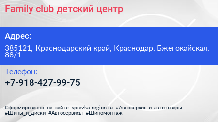Family club, детский центр по адресу 385121, Краснодарский край, Краснодар, Бжегокайская, 88/1 в дальнейшем Организация, размещена в следующих категориях: