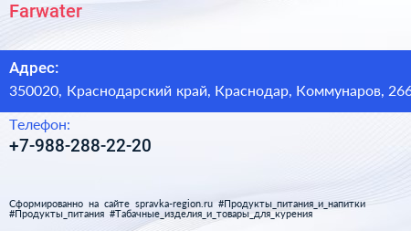 Farwater по адресу 350020, Краснодарский край, Краснодар, Коммунаров, 266 в дальнейшем Организация, размещена в следующих категориях: