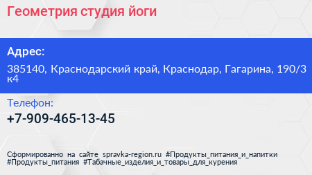 Геометрия, студия йоги по адресу 385140, Краснодарский край, Краснодар, Гагарина, 190/3 к4 в дальнейшем Организация, размещена в следующих категориях: