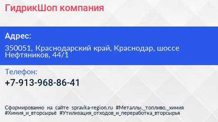 ГидрикШоп, компания по адресу 350051, Краснодарский край, Краснодар, шоссе Нефтяников, 44/1 в дальнейшем Организация, размещена в следующих категориях: