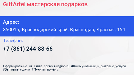 GiftArtel, мастерская подарков по адресу 350015, Краснодарский край, Краснодар, Красная, 154 в дальнейшем Организация, размещена в следующих категориях: