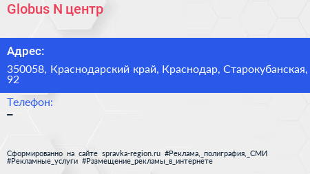 Globus-N, центр по адресу 350058, Краснодарский край, Краснодар, Старокубанская, 92 в дальнейшем Организация, размещена в следующих категориях: